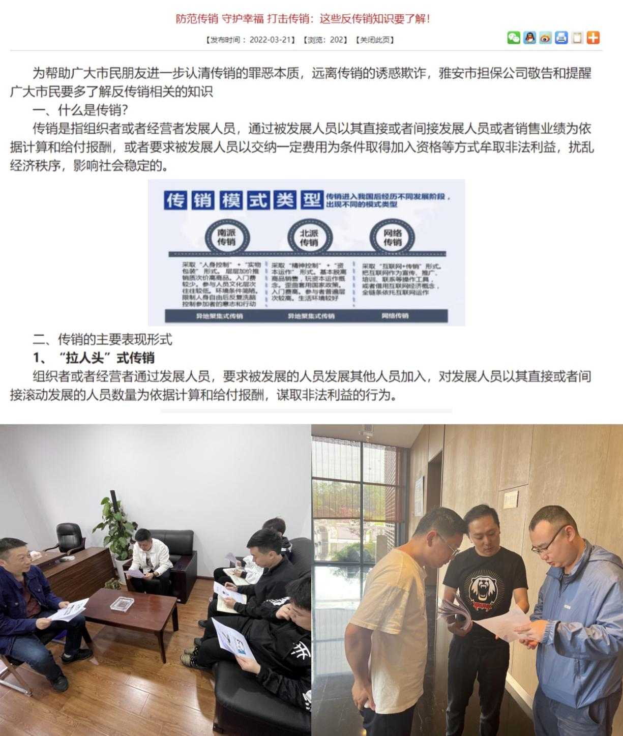 在打擊傳銷“宣傳教育周”活動中,市擔保公司一方面通過官網(wǎng)、微信群、分組學(xué)習等方式,積極向員工宣傳打擊傳銷知識;另一方面利用外出辦理業(yè)務(wù)的機會,廣泛地向公司客戶宣傳禁止傳銷的法律法規(guī)。實現(xiàn)了多渠道、多層面、多角度、多形式開展宣傳警示活動,揭露傳銷行為的欺騙本質(zhì)和危害性,增強干部職工及客戶辨識、防范傳銷能力,提高自我防護意識,營造全社會共同參與打擊傳銷的氛圍,維護社會和諧穩(wěn)定,為我市經(jīng)濟社會全面協(xié)調(diào)發(fā)展服務(wù)。