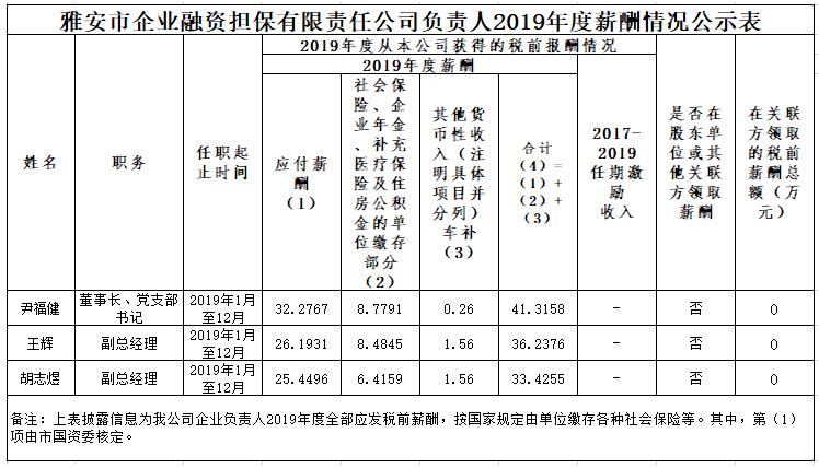 雅安市企業(yè)融資擔保有限責任公司負責人2019年度薪酬情況公示表